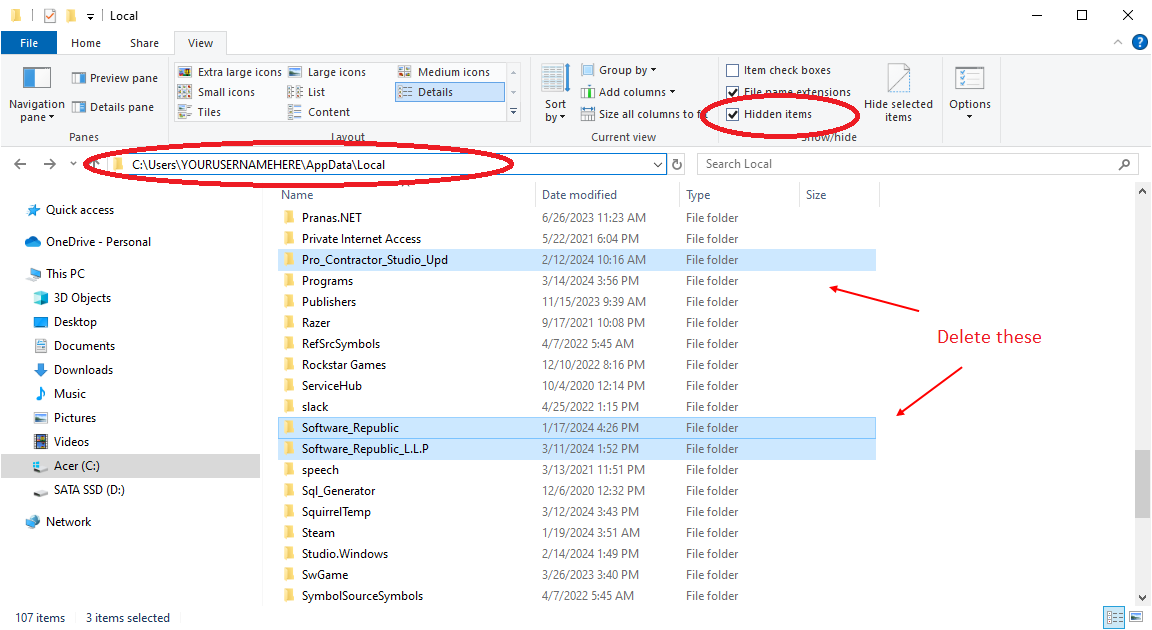 - Select all folders that contain the words Pro_Contractor_Studio and/or Software_Republic. You can select multiple folders by holding the “Control” key on the keyboard and clicking on the folders with the left mouse button.