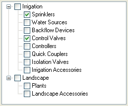 In the Category Filter location, click on each category to label one time with the left mouse button until a checkmark appears in the box. Categories that have not been selected will not be labeled. For example, in the illustration below, all sprinklers and control valves will be labeled automatically while the remaining irrigation, landscape, lighting, and drainage equipment will not.
