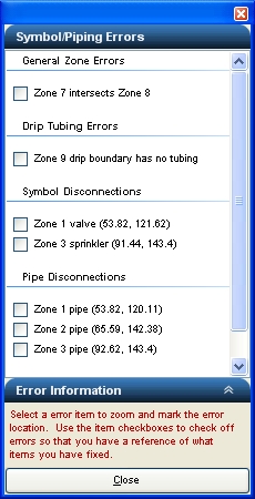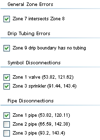 When automatically sizing pipe, you may receive the Disconnection Errors dialog box containing a list of locations within the layout where pipe is not connected to another piece of pipe or to a piece of irrigation equipment.