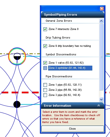Click on a disconnection in the list. The software will center the problem in the piping layout on the screen and highlight the problem area with a animated colored circle