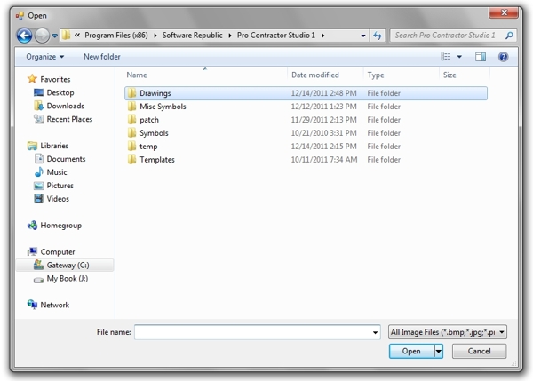 Select the type of file to load from the Files of type drop down list. Pro Contractor Studio� will allow you to load Windows Bitmap (*.bmp), JPEG Bitmap (*.jpg), Portable Graphics Network (*png) and TIFF Bitmap (*.tif) image files.