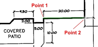 You will need to locate two points on the image that are a known distance apart from one another. For example, the length of a property line, the length of a building wall, or the width of a sidewalk or driveway. Set a point at each end of the known distance. For example, in the illustration below the user is setting a point at each end of a building wall that is 20 units in length.