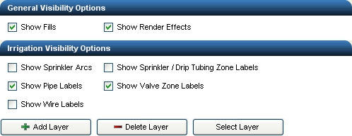 Click on the Select Layer button at the bottom of the Layer Manager. All entities on the current layer will be selected on the design screen. You can then use other commands to manipulate the selected entities such as the Move or Rotate commands. The Move to Front or Move to Back commands used in conjunction with the Select Layer command is an easy way to move sprinkler symbols on top of pipe or move pipe underneath all irrigation symbols.