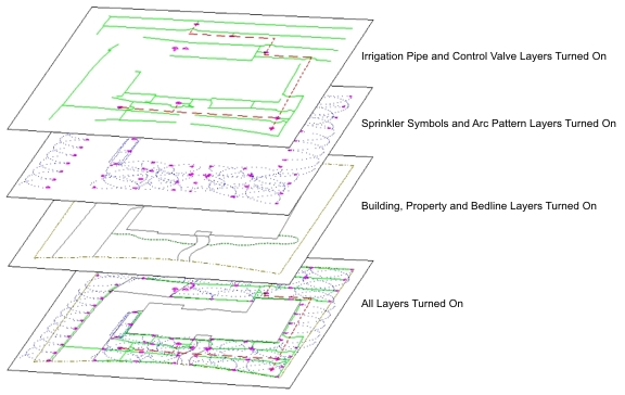 The software automatically assign entities such as sprinkler symbols, plant symbols, irrigation pipe and more to specific layers. You may create additional layers in the Layer Manager.