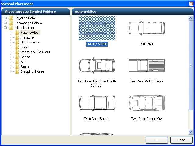The Miscellaneous Symbols command allows you to place a list of miscellaneous symbols such as furniture, stepping stones and more on the drawing screen. Use these symbols to dress up a drawing and make it more meaningful or attractive to the end customer or prospect. Each symbol is an individual drawing file that must be stored in the ...\Pro Contractor Studio\Misc Symbols\Miscellaneous folder on the computer.