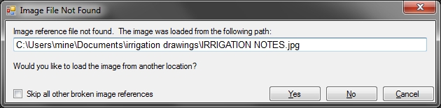 Click on the Yes button to locate the image file from another location on the computer and reassociate it with the drawing.