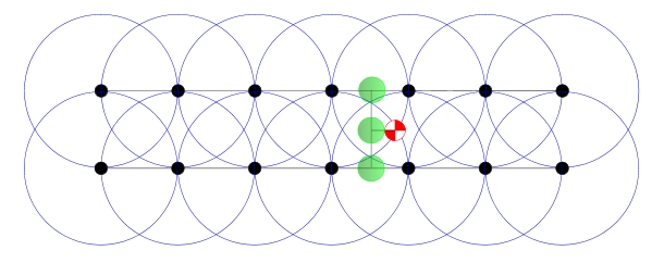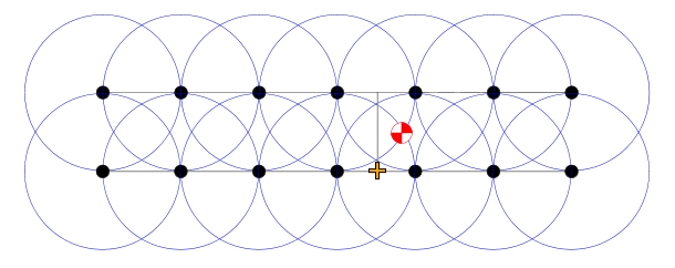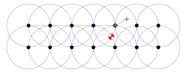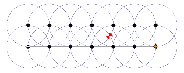 Now that you have drawn pipe between the sprinklers on each row, you can draw pipe connecting the two rows. Click on the Draw Pipe button in the Pipe Placement command and draw a piece of pipe connecting the two rows. Set a point with the left mouse button close to a piece of pipe on each of the sprinkler rows. Press the Enter key and the pipe will be drawn between the rows. Refer to illustration three below.