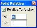 Click on the Relative to Anchor checkbox to add or remove the checkmark. If the box has a checkmark, the new point will be positioned relative to the current Anchor Point location. If the box does not have a checkmark, the new point will be positioned in relationship to the point or origin which is the point with X and Y coordinates of 0,0 in the bottom left corner of the design, also know as Point Absolute.